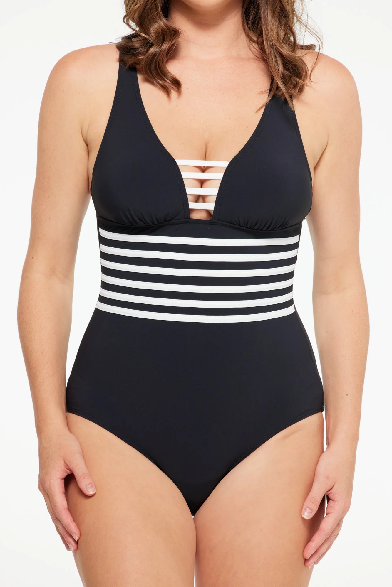 Introducing a trending favorite: the V Neck Binding one-piece swimsuit. This stylish piece features a deeper V neckline supported by vertical binding across the bust, ensuring both a flattering fit and excellent support. Crafted with white binding, it enhances the overall appeal and adds a touch of contrast. Perfect for making a chic statement at the beach or pool, this swimsuit seamlessly blends fashion and functionality.