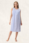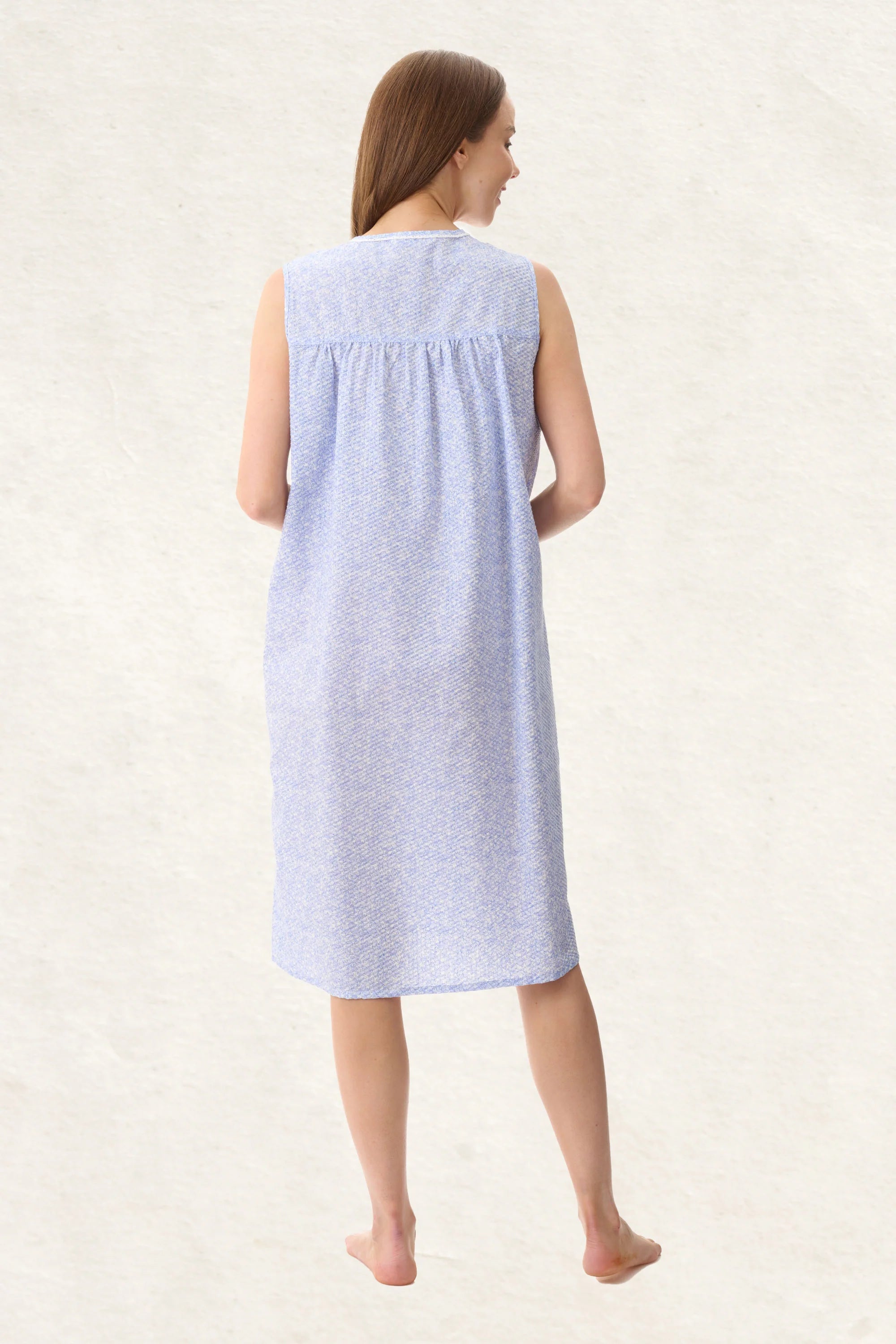 Hilda sleeveless short nightie in blue print is an easy care garment made in polyester cotton woven seersucker and perfect for summer. The neckline is trimmed in a lovely lace and the curved front yoke is trimmed with self piping. The skirt of the nightie is gathered onto the front and back yokes allowing for extra comfort. Front button opening with self band on neckline and armholes. Sitting just below the knee this nightie is perfect when also adding the matching brunchcoat to create a fresh, crisp summer set.