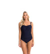 A popular one piece swimsuit in textured navy. This suit features moulded cups with removable and adjustable thick straps with flattering ruching and power netting for added support and tummy toning. This swimsuit is suitable for mastectomy.