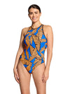 The Zoggs Awaken Blue Crossback thermal one piece offers support and freedom of movement with its high front and cross back design. The striking Awaken Blue print will have you looking and feeling amazing featuring a bright blue and orange coral leaf design! This bold print will ensure you remain visible in the open water too.